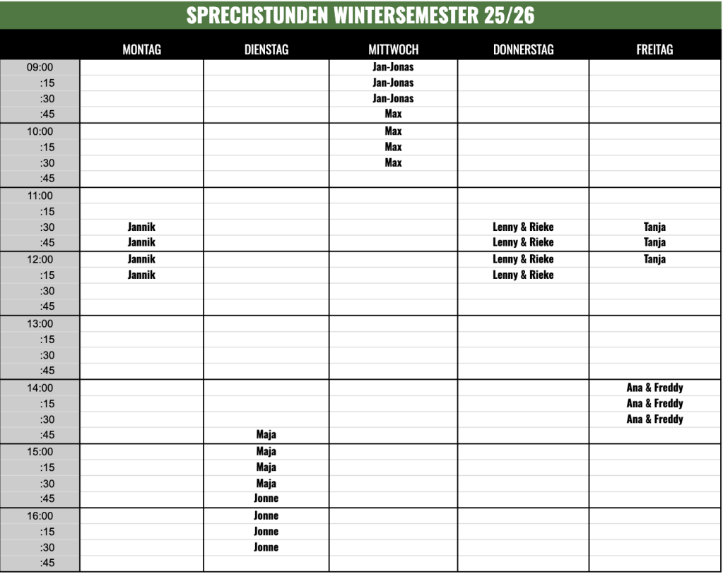 Ihr habt ein Anliegen, wollt uns mal persönlich kennenlernen oder einfach ein kaltes Getränk zu günstigen Preisen kaufen? Dann kommt gerne während unseren Sprechstunden in unserem Büro (Gebäude E – Raum 0.071) vorbei!